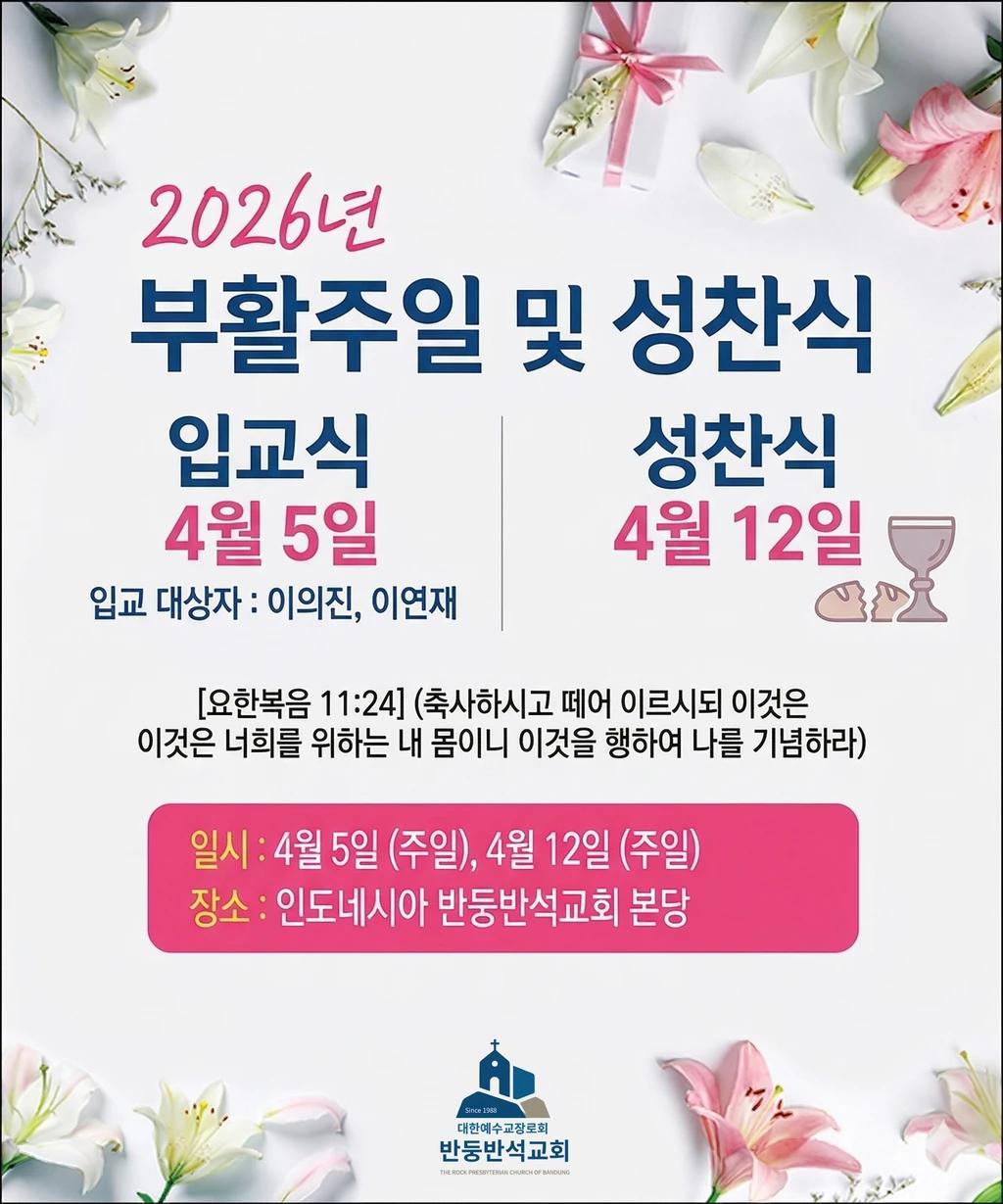 2026년 상반기 입교식 및 성찬식 안내 할렐루야! 반둥반석교회 성도님들께 주님의 이름으로 문안드립니다. 다가오는 4월, 우리 교회에 큰 기쁨의 두 성례가 있습니다. 1. 입교식 일시: 2026년 4월 5일 (주일) 입교 대상자: 이의진, 이연재 2. 성찬식 일시: 2026년 4월 12일 (주일)